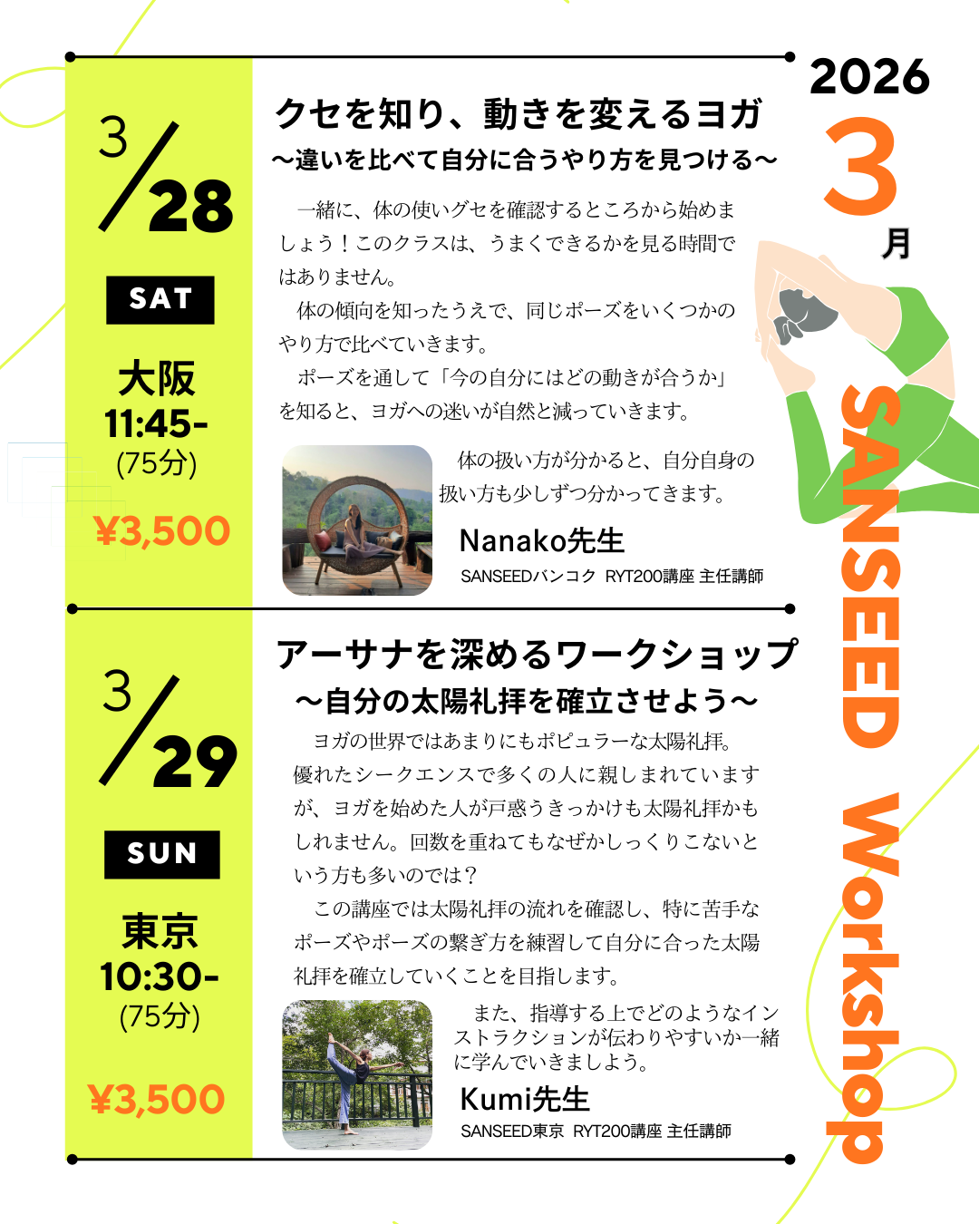 SANSEEDヨガスタジオでは、2026年3月(28日・29日)に大阪・東京にて、RYT200講師陣による特別ワークショップを開催いたします。